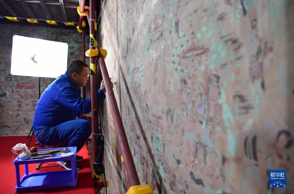 敦煌研究院文物保护技术服务中心壁画修复师杨金礼在莫高窟第231窟内修复出现病害的壁画(4月19日摄)。新华社记者 陈斌 摄