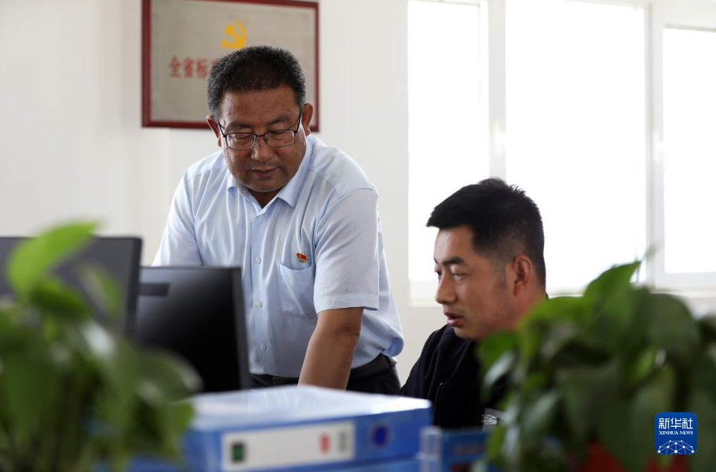 在甘肃省武威市古浪县黄花滩富民新村党群服务中心,富民新村党总支书记张延堂(左)和同事商讨工作(6月12日摄)。新华社记者 张智敏 摄