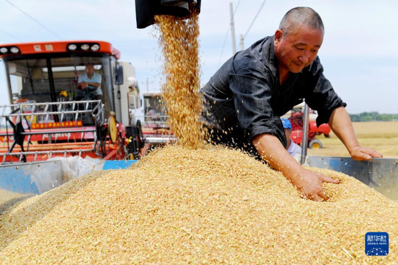 河北省衡水市阜城县崔家庙镇前砖门村农民在麦田收获小麦(2021年6月13日摄)。新华社记者 朱旭东 摄