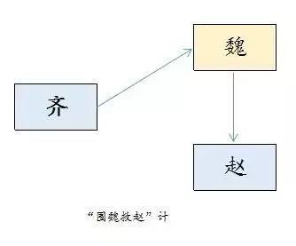 三十六计之“围魏救赵”计,原指战国时齐军用围攻魏国的方法,迫使魏国撤回攻赵,而使赵国得救,其策略模型如下图: