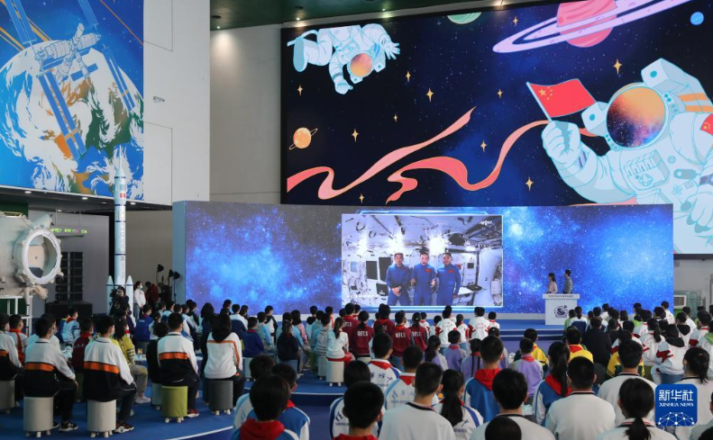 2021年12月9日,“天宫课堂”第一课开课,神舟十三号乘组航天员翟志刚、王亚平、叶光富在空间站进行太空授课。这是学生们在北京中国科技馆听课。新华社记者 金立旺 摄