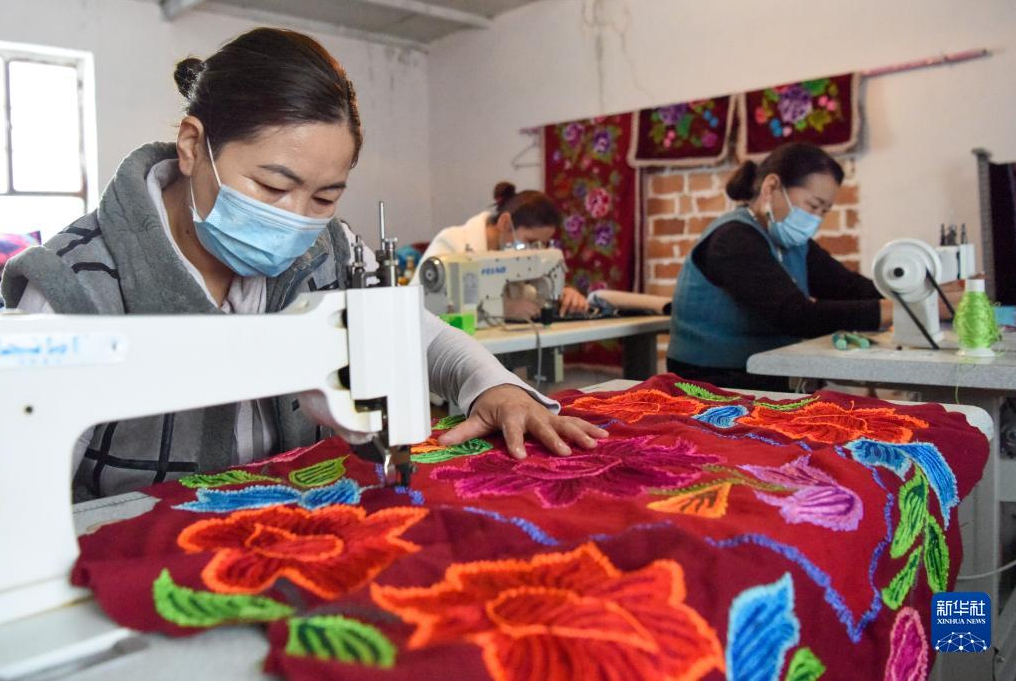 在新疆吉木萨尔县白泉村刺绣专业合作社,绣娘在制作哈萨克族刺绣(2021年1月23日摄)。新华社记者 丁磊 摄